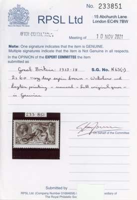 1913 2s6d Very deep sepia brown (Vandyke brown). Very fine and fresh unmounted o.g. printed by Waterlow. Lovely fresh colour. SG399var. Spec. N63(1). 2021 RPS Cert. Cat £3,750.