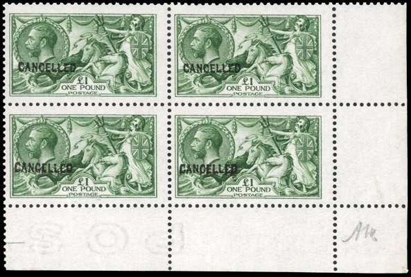1912 Waterlow ‘Seahorse’ £1 colour trial in yellowish green, on Joynson paper, mint, unmounted og (mounted in selvedge) overprinted ‘SPECIMEN’ (Type 24), lower right corner marginal block of four showing part ‘POST(AGE)’ watermark inverted, Very fine. BPA Certificate (2022). SG 403 var, Spec N72