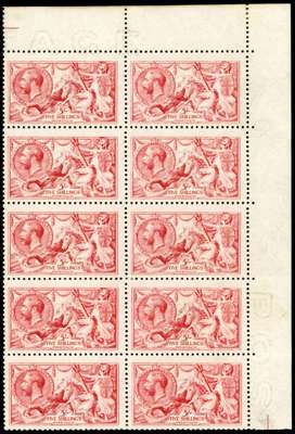 1915 5/- pale carmine (worn plate), top right hand corner marginal block of ten, brilliant o.g. (hinged on one stamp only), and typical folds, a splendid and rare multiple. SG 410 £14,000+