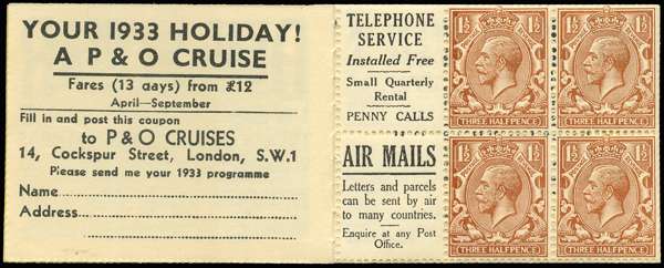 1924 1½d Red-brown Booklet Pane (Wmk. Inverted). Very fine unmounted o.g. booklet pane of four plus 2 adverts for "Telephone Service/ Air Mails, Letters and Parcels" perf. type P, with above average perforations. Pane still contained within original booklet BB12 Edition No.219 (Other panes removed). Spec. NB15a(9).