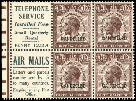 Great Britain 1929 PUC 1½d advert booklet pane optd CANCELLED SG 436b,var