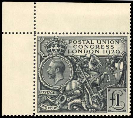 1929 PUC £1 black, top left marginal example with full original gum (mounted on selvedge only), minor gum bend and light overall toning as usual. Fine . SG 438
