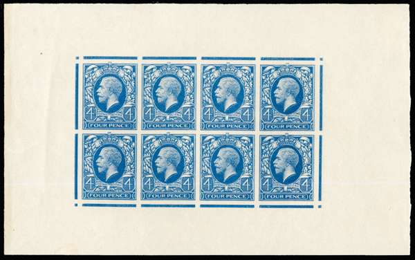 Great Britain 1934 4d Photogravure colour trial. Superb unmounted o.g. imperforate complete sheetlet of eight prin…