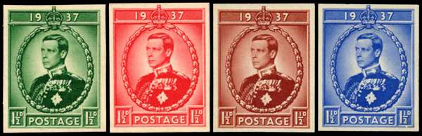 1936 KEVIII Coronation Essays Type H set of four in green, red, brown and blue on gummed E8R (sideways) wmkd paper, depicting the King in his uniform of the Welsh Guards, brilliant o.g. with 1½d in green and red mounted on thin card, very fine and rare, one of only six sets released. SG 459var £7000