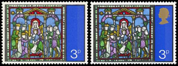 1971 Christmas 3p, showing error Gold, Queen's Head omitted, mint unmounted o.g. very fine, offered with normal for comparison. Pierron records c.24 mint examples. SG 895a £1500