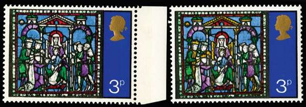 1971 3p Christmas. Very fine unmounted o.g. right hand marginal example with Lemon (window panels) omitted. Offered with normal for comparison. 2010 RPS certificate of a block of four from which this single was taken.