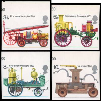 1974 Fire Engines set of four, upper marginal imperforate imprimaturs, with ‘BPMA’ h/s on reverse, unmounted o.g. fine. SG 950-953var