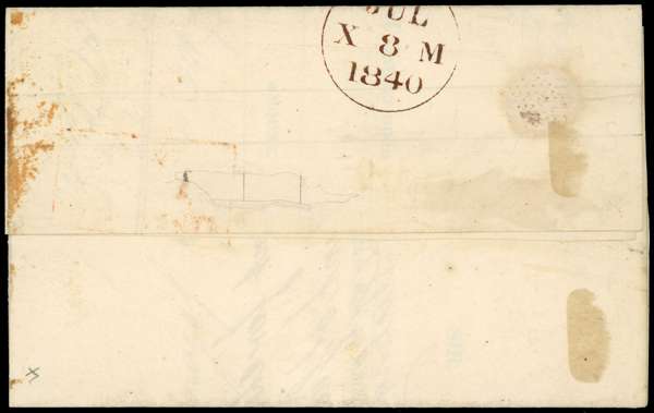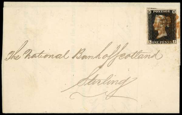1840 entire letter to Sterling, bearing 1d black Plate 4 (LJ) four close to large margins with trace of adjoining stamp at top (KJ), showing red MC, backstamped by despatch cds for JUL 8, a clean and neat cover. SG 2