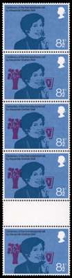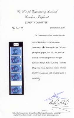1976 Telephone Centenary 8½p, vertical gutter strip of five, top stamp showing error deep rose (vase and picture frame) omitted, mint unmounted o.g. very fine and rare. Pierron records only 20 mint examples. BPA Cert (2014) SG 997a £4750
