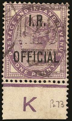 Great Britain 1882 1d Lilac (I.R. Official). Very fine used bottom marginal control "K" example, Perf type P cance…
