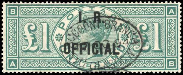 I.R. OFFICIAL: 1892 £1 green (AB), used showing Account Branch P.O. Glasgow cds for OC. 17. 1894, fine example. SG O16 £2000