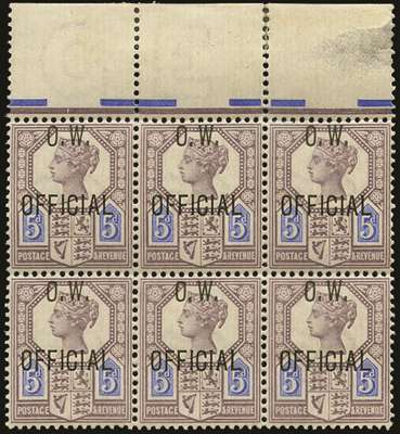 1902 5d Dull purple & blue (O.W. Official). Superb unmounted o.g. top marginal block of six, from positions R.1/8-R.2/10. Beautiful quality and believed to be the largest surviving multiple in private hands. Ex DLR archives and Michael Astley collection.