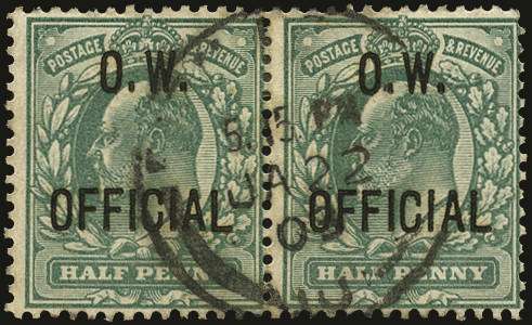 Great Britain 1902 ½d Blue-green (O.W. Official). Very fine used horizontal pair with overprint settings 1+2, neat…