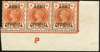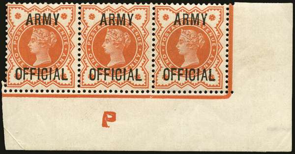 1896 ½d Vermilion (Army Official). Very fine unused o.g. bottom right hand corner marginal control "P" horizontal strip of three, Perf type I. Overprint Forme 1 showing "Split L of Official" and "Bent first F of Official" constant varieties (Wiseman Spec. A90 & A90a). Ex Michael Astley Collection.