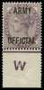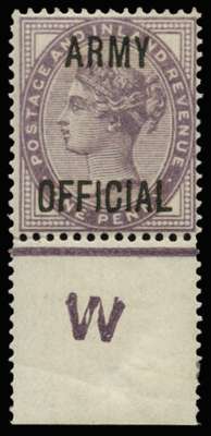 1896 1d Lilac (Army Official). Superb unused o.g. imperforate "W" control example with a huge perf encroachment at foot making it appear as a perforated control. Scarce.