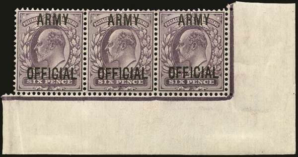 1902 6d Pale dull purple (Army Official). Very fine unused o.g. bottom right hand corner marginal strip of three showing long top to second "F" variety from position R.20/11. Spec MO21j. Ex Michael Astley Collection.