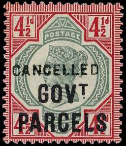 GOVERMENT PARCELS: 1892 4½d green & carmine, optd ‘CANCELLED’ type 14, minor corner crease at upper left, otherwise fine, still an attractive example of this rare departmental issue. BPA Certificate (2006) SG O71var; Spec L.26t