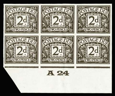 1924 2d Agate "Postage due" (1st Harrison printing). Very fine unmounted o.g. bottom marginal "B24" control block of six imperforate imprimaturs, each stamp with a "BPMA" handstamp on reverse. Vertical crease through centre pair and one small gum thin nevertheless a spectacular and unique positional piece.