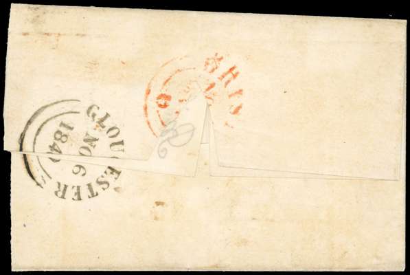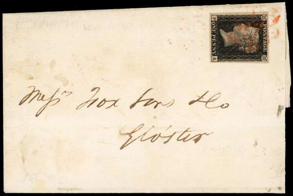 1840 1d black Plate 7 (PA). Wrapper sent from Bristol to Gloucester bearing a a four-margined example tied by a vermilion MC. Bristol datestamp on reverse in the same colour. A rare coloured cross. 2021 BPA Cert. Spec. AS44vh, cat £2,250.