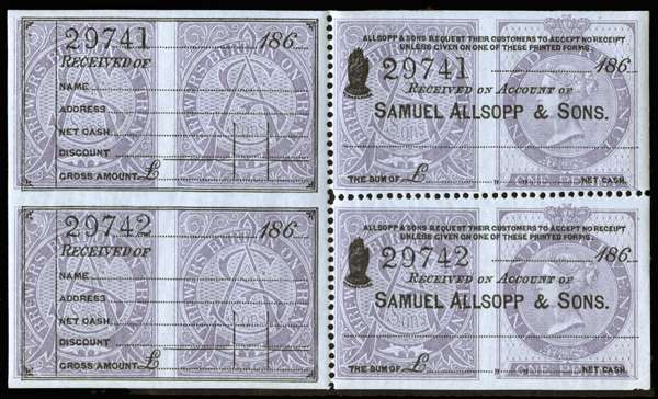 1863 Samuel Allsopp & Sons Receipt/Excise labels. (Wmk Cabled anchor). Superb unmounted o.g. pane of eight comprising of two se-tenant strips of four. Produced by the brewing company with the authority of the inland revenue for the purpose of recording excise duties and issuing reciepts. Extremely rare so fine.