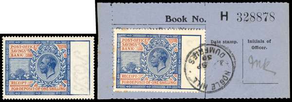 REVENUE: 1911-20 1s light blue and red (Mackennal portrait) Post Office Savings Bank 1s Stamps, one mint unmounted example and a second used on piece, cancelled Dumfries ‘3 SP 30’, scarce and attractive. SG Spec POSB2 £310