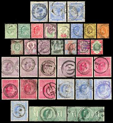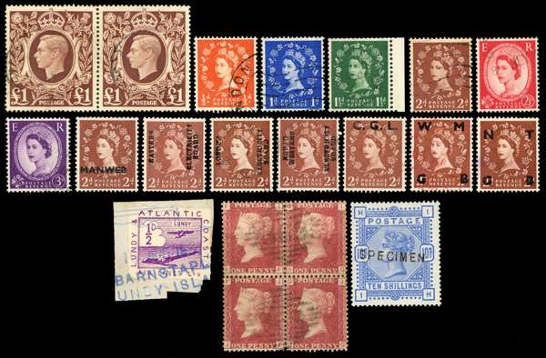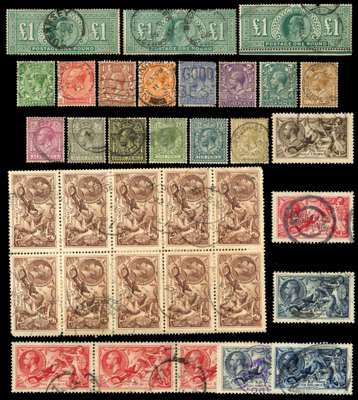 1841-1960 (c.) used selection arranged on Hagner sheets including 1840 1d, 1867-83 5s, Plate 1 (2), Plate 2, Plate 4, 1883-84 2s6d (5), 5s (7) 10s (3) plus a mint example overprinted ‘SPECIEMEN’, KEVII 2s6d (4), 5s (5), 10s (4), £1 (5) and KGV values to 10s. Condition very mixed. (172)