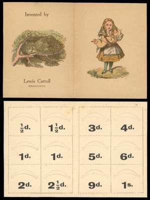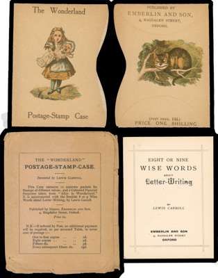Ephemera: 1890 Alice in Wonderland Postage Stamp case in four parts with the outer case (2) depicting Alice holding a baby, a twelve compartment folder (2) for stamps depicting Alice holding a pig and a forty page booklet "Eight or Nine Wise Words about Letter-Writing" by Lewis Carroll printed by Emberlin and Son, Oxford plus its original paper envelope. Very fine