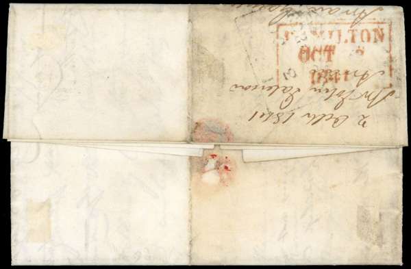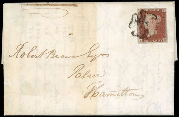 1841 entire letter sent locally in Scotland, from Robert Brown correspondence, bearing 1d red-brown Plate 2 (FB) from black plate four good margins, tied by black MC, backstamped by boxed Hamilton arrival mark for Oct 1841, usual filing folds, still attractive. SG 7