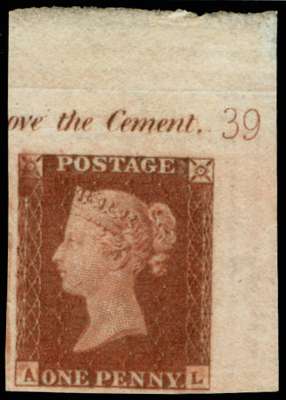 1841 1d red-brown Plate 39. Superb unused imperforate top right-hand corner marginal imprimatur lettered AL, showing part inscription and plate number 39. Rare. Ex Bates (1934).