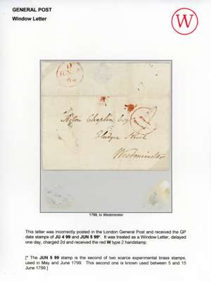 1799 General post/Window letter. Wonderful cover addressed to Westminster bearing a ‘W’ Window handstamp in red with a black London despatch cds for JU 4 1799 and a red experimental single-ring (4.5mm, type 11a) datestamp used on the first date of issue JU 5 1799; this cds was only in use for eleven days from JU 5-15.1799. Charged 2d as indicated in manuscript. Very rare and unusual.