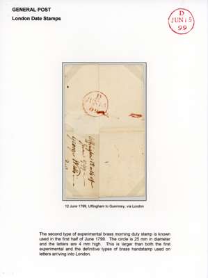1799 pre-stamp. Wonderful cover sent from Uffingham to Guernsey with a well-struck red brass datestamp of London. This second brass type date-stamp (45mm, code D) was in use for only 11 days from June 5-15th 1799 with this example being on the last day of use. Struck across the flap but a scarce item. Willcocks & Jay Spec. 11a. Rarity E.