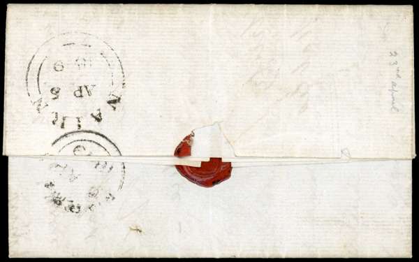 1849 entire letter from Cawdor Castle (of Shakespeare's Macbeth fame, where the Witches foretold that he would become Thane of Cawdor and King thereafter!) addressed to Forres, bearing 1d red-brown Plate 70 (FB) four good margins tied by ‘264’ numeral cancel for Nairn, with ‘CAWDOR’ boxed h/s at left in blue, backstamped by Nairn d/s for AP 5 and arrival for AP 6, an attractive cover. SG 8