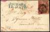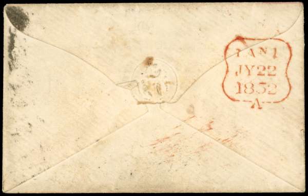 1852 cover to Cavendish Square London, bearing a hand-illustrated impression of a stamp, traced from the ‘Bun Head’ Wyon coin effigy (same dimensions as an old penny) executed in ink and Indian red watercolour wash, showing a ‘73’ London numeral and Brompton Road 1d PAID h/s in blue, (presumably paying postage over the counter) with hexagonal P.D. mark for JY 22 and backstamped by same mark, some stains, otherwise fine, an intriguing and attractive item. Offered with a ‘Bun Head’ Penny (dated 1892) for comparison.