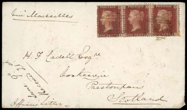 1856 (9 June) officer’s letter from the Crimea franked strip of three 1d orange-brown (shade) neatly tied by two OXO cancels, addressed to Prestonpans, Scotland. Some short perfs.