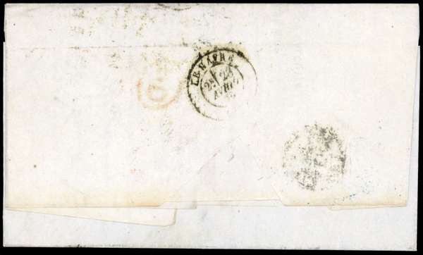 POSTAL HISTORY: 1870 cover to France bearing 4d vermilion cancelled by light London duplex which the counter clerk additionally postmarked with a red by boxed ‘L1’ handstamp, a 1d red, plate 118 (CC), paying the one penny late fee tied by similar duplex only, the obverse with boxed ‘L1’ and oval ‘PD’ in red, and Le Havre arrival cancels. A most attractive and unusual entire