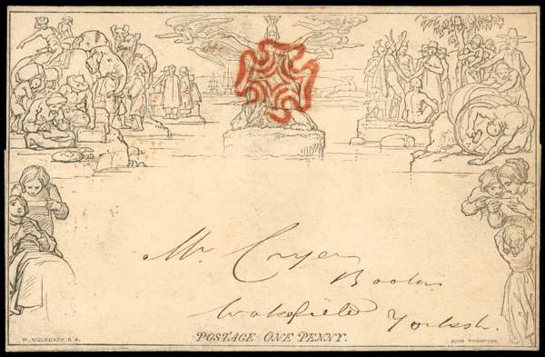 1840 (29 June) 1d Mulready lettersheet, stereo A69, used from London to Wakefield with fine red cross. Some paper in corners in interior where mounted in album. SG ME1. Cat. £450