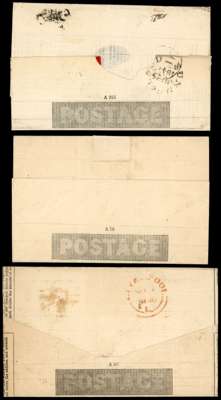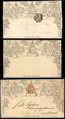 Mulready: unused letter sheet unused (Stereo A78), 1840 (NO4) folded printed part entire with adverts including Manuals of Natural History and British birds, general atlases and globes used from Liverpool to Durham with very fine red Maltese cross and 1841 lettersheet (A41) used within Sunderland with black Maltese cross