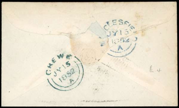 1841 four-margined strip of three 2d blues from plate 4 lettered CF-CH with 1d IF, tied by crisp 180 numerals to registered envelope Chester to Macclesfield 14 July 1852. Faint pressed crease barely detracts from fine appearance. SG 8 & 14.