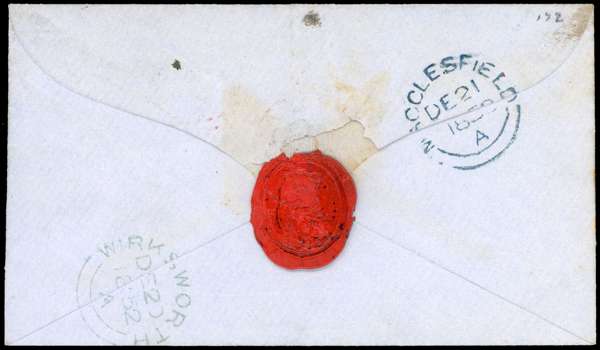 1841 four-margined strip of three 2d blues from plate 4 lettered TF-TH (TH being the State One re-entry) with 1d OH tied by light 895 numerals to registered envelope, Wirksworth to Macclesfield 22 December 1852. Filing crease at top through stamps barely detracts from fine appearance. SG 8 & 14.