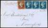 GB 1852 2d blue Plate 4 strip on registered cover ???? origin