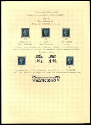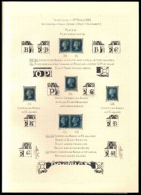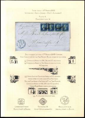 1841-55 2d blue Plate 4 mostly fine used selection on well-illustrated album leaves including strips and pairs, early and late printings, including SG 19 QD-QG and SG 23 LI-LL both on registered covers, mostly matchings of SG 14 and 19, clean lot (35 stamps).