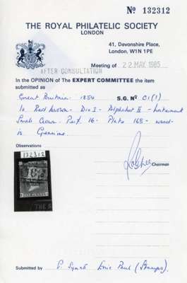 1854 1d red brown, Die I, Alphabet II, Wmk. Small crown, Perf. 16, Plate 168 (FA), cancelled by Cardiff '162' numeral, perforations cut down at right and foot, some trimmed at top nevertheless a very rare plate of which only five examples are believed to exist in private hands. Offered with matched imperforate example from the same plate (SG 8). RPS Certificate (1985). SG 17; Spec C1(1)