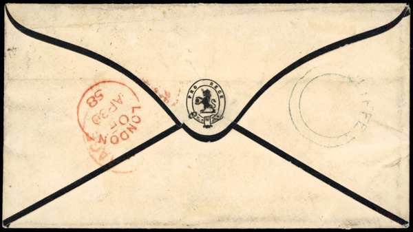 1858 (29 April) mourning envelope franked by a pair of 2d plate 4 AE-AF (SC 16) and a single plate 5 EA (SC? 14), the latter with small perf faults, both tied Dorchester sideways duplex, Cliffe UDC on reverse, addressed to Baron Fagel in the Netherlands. A rare combination of mixed plates and perforations. Ex Alcock. SG 19 and 20a (or 34).