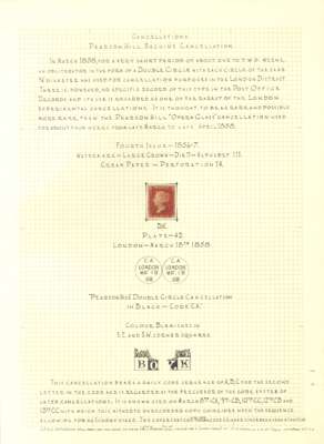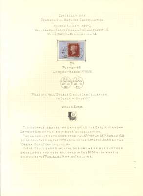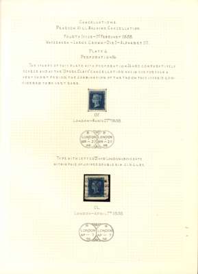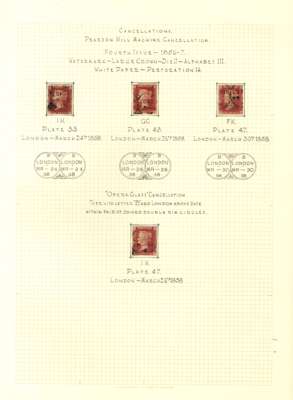 1858 Pearson Hill experimental cancels small group written up on leaves on 1d reds and 2d blues, 2 pieces and 6 stamps, with PHT 3 double CDS on 1d red (2 including complete strike on piece) and PHT 4 Opera Glass, four on 1d red stamps and two on 2d blues, both SG 36a, one being a large part strike on piece. All plated, dated March or April 1858. Chiefly fine and a scarce group.