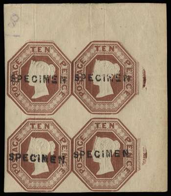 1848 10d brown. Very fine and fresh large part o.g. corner block of four overprinted SPECIMEN type 1. An extremely rare and attractive multiple. SG 57s cat £12,000+