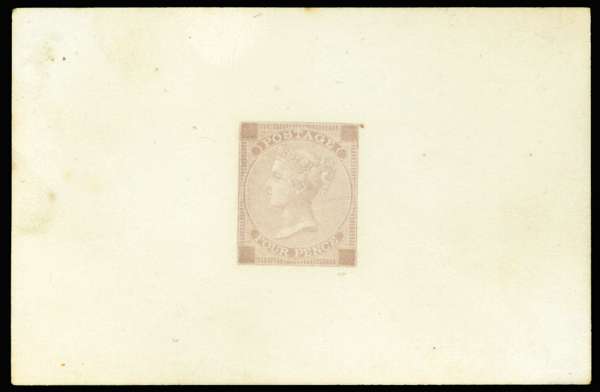 1870 4d Die proof. Very fine example without corner letters or plate numbers, printed in dull lilac on white matt card (92 x 60mm). A very rare proof.