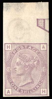 1882 1s purple Plate 13. Very fine unmounted o.g. top marginal imperforate imprimatur, lettered AH. Very rare; this value was intended for a surcharged issue but was subsequently abandoned, one of only 35 possible examples, many of which are in institutional collections.