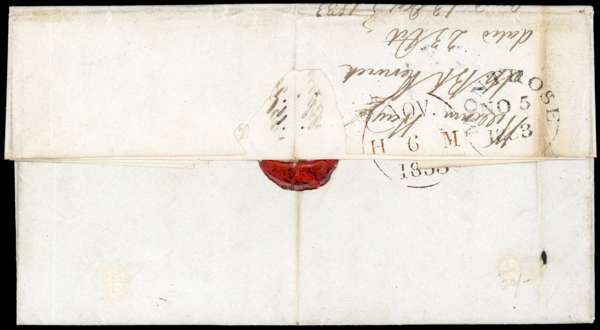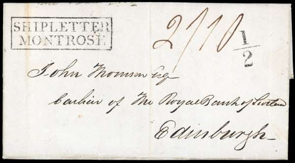1833 cover from Lerwick, Shetland, to Edinburgh, landed at Montrose and bearing a superb strike of boxed ‘SHIPLETTER/MONTROSE’ handstamp in black, hand struck ‘½’ at right, backstamped with Montrose (5.11) transit and Edinburgh (6.11) arrival; vertical filing folds. Rare