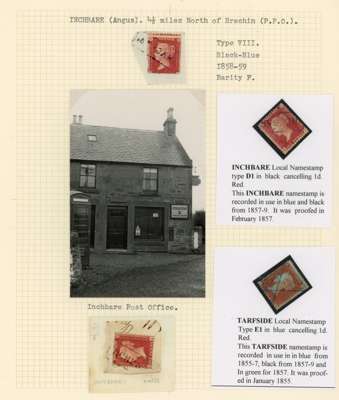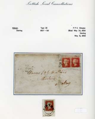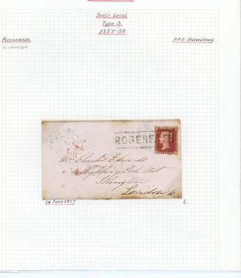 CANCELLATIONS: Scots locals selection franked with 1d red-brown arranged on album leaves comprising eleven stamps (nine on small pieces) and four covers with 1857 from Roseneath, 1858 from Tyree, from Old Kilpatrick and from Killearn. Condition a little mixed.