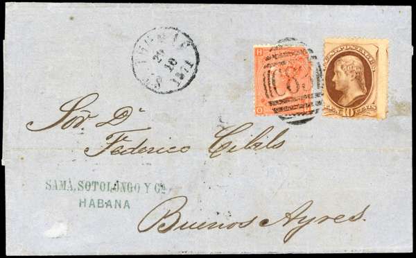 GB Used Abroad; Brazil: 1871 Entire from Havana to Buenos Ayres, franked with USA Jefferson 10c brown and GB 1865-73 4d vermilion Pl. 12 (faults), tied by lovely strike of C83 (Rio de Janeiro) barred oval, with St Thomas transit mark of 29 10 1871 to left. Light staining and filing crease clear of adhesives, still an attractive and rare combination franking.